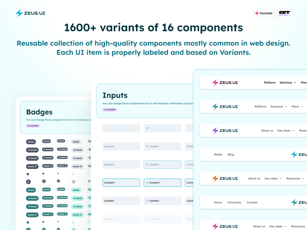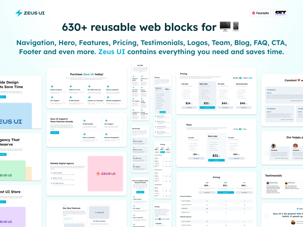 โก๏ธ Zeus UI is a multipurpose web design system to create hassle-free landing pages in Figma. Based on 10 landing page templates, powered by 1600+ variants for 16 components and 630+ wireframe blocks. Equipped with free fonts (OFL) which are hosted at Google fonts. You're about to purchase a handy & organized design asset entirely based on Figma color & text styles.